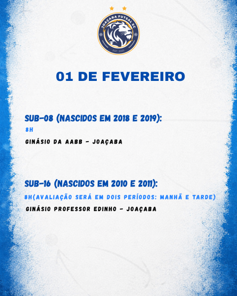 O Joaçaba Futsal está com inscrições abertas para as seletivas das categorias de base Sub-08, Sub-10, Sub-12, Sub-14, Sub-16 e Sub-18, visando à formação das equipes para a temporada 2026. Os interessados podem se inscrever até o dia 29 de janeiro, exclusivamente pelo site https://joacabafutsal.digital.esp.br/.
