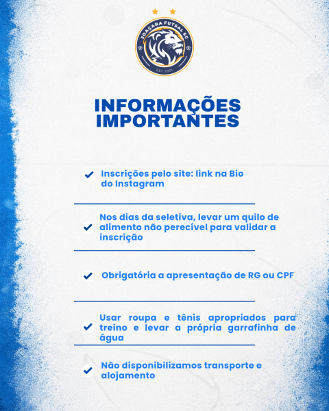 No dia da seletiva, a inscrição será validada mediante a doação de um quilo de alimento não perecível. É obrigatória a apresentação de RG ou CPF. O atleta deve chegar com antecedência, vestindo roupa e tênis adequados para treino, além de levar a própria garrafinha de água.