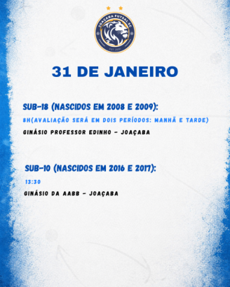 Sub-18 (2008 e 2009): 31/01, 8h – Ginásio Professor Edinho